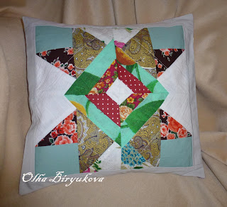 Для начала по Дублириновскому МК сшила блоки на наволочку для думки. Схему не печатала, а просто от руки перерисовала с монитора. В итоге не рассчитала, чтобы все симметрично было, плюс у пары лоскутков размера не хватило... но сделала